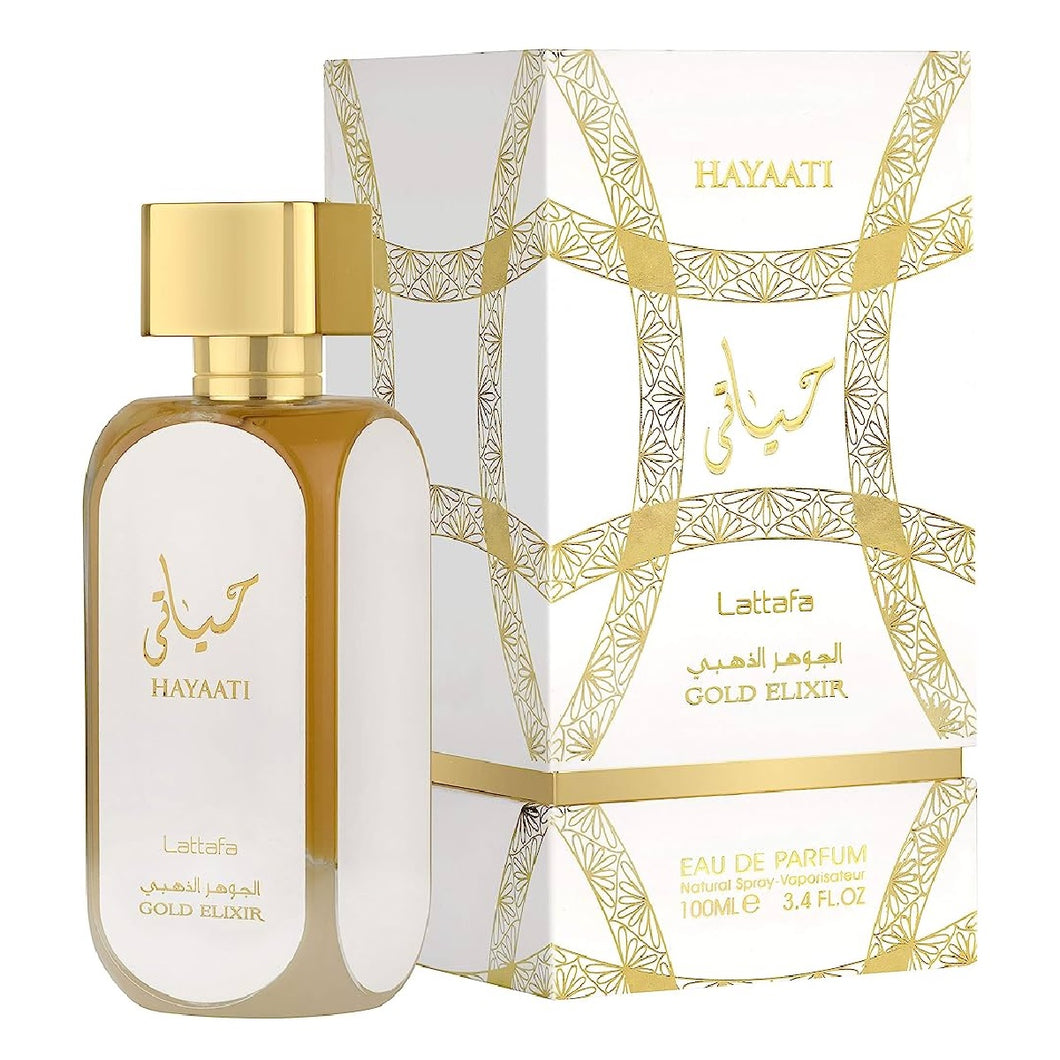 Hayaati Gold Elixir de Lattafa Perfumes es una fragancia de la familia olfativa para Hombres y Mujeres. Las Notas de Salida son bergamota, casis (grosellero negro) y toronja (pomelo); las Notas de Corazón son cuero, durazno (melocotón) y azafrán; las Notas de Fondo son vainilla, ámbar, almizcle y vetiver.
