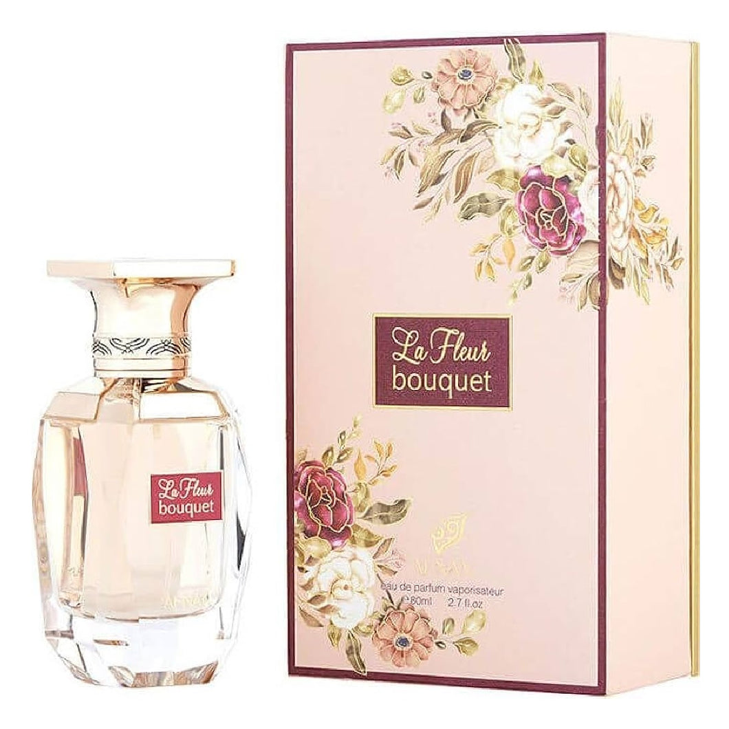 La Fleur Bouquet de Afnan es una fragancia de la familia olfativa Floral para Mujeres. La Fleur Bouquet se lanzó en 2021. Las Notas de Salida son flores blancas y flores; las Notas de Corazón son frutas, cítricos y almizcle; las Notas de Fondo son notas dulces, notas atalcadas, rosa y maderas exóticas.