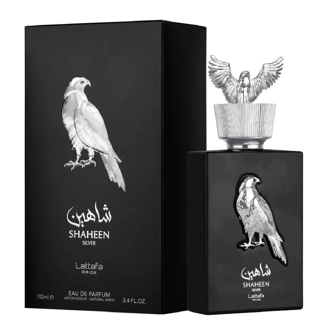 Shaheen Silver de Lattafa Perfumes es una fragancia de la familia olfativa Verde Aromática para Hombres y Mujeres. Las Notas de Salida son bergamota y casis (grosellero negro); las Notas de Corazón son pachulí y rosa; las Notas de Fondo son musgo de roble, almizcle y ámbar.