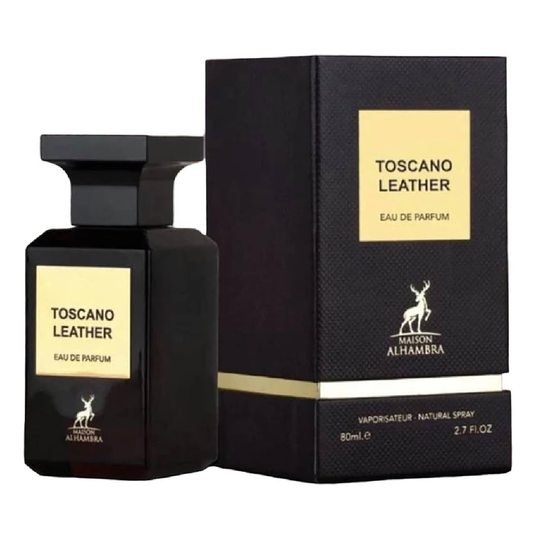 Toscano Leather de Maison Alhambra es una fragancia de la familia olfativa Cuero para Hombres y Mujeres. Las Notas de Salida son azafrán, notas de animal y tomillo; las Notas de Corazón son cuero, frambuesa, notas amaderadas, incienso y jazmín; las Notas de Fondo son cuero y ámbar.