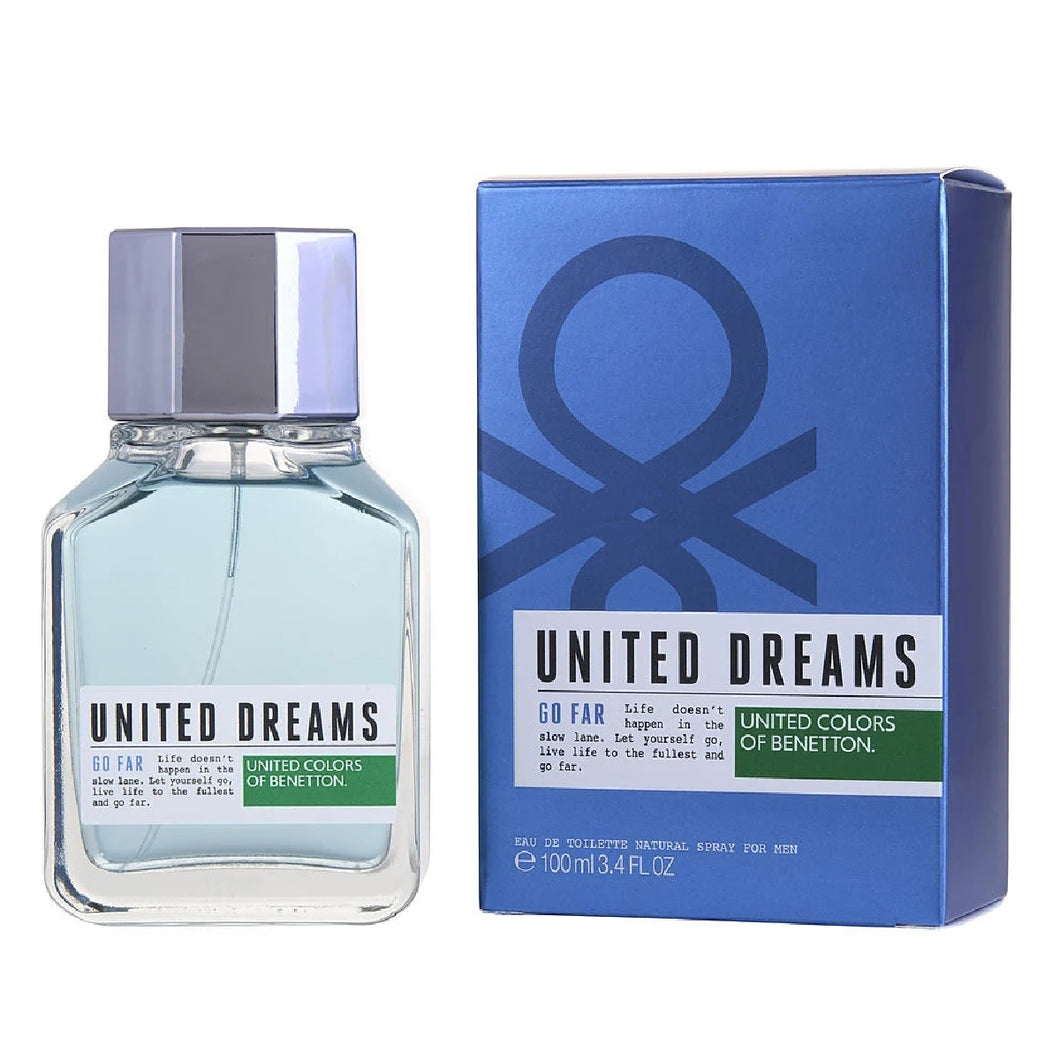 United Dreams Men Go Far de Benetton es una fragancia de la familia olfativa Aromática Acuática para Hombres. United Dreams Men Go Far se lanzó en 2015. Las Notas de Salida son notas marinas, cidra y lima (limón verde); las Notas de Corazón son lavanda, flor de loto azul y cardamomo; las Notas de Fondo son cedro, musgo y ámbar.